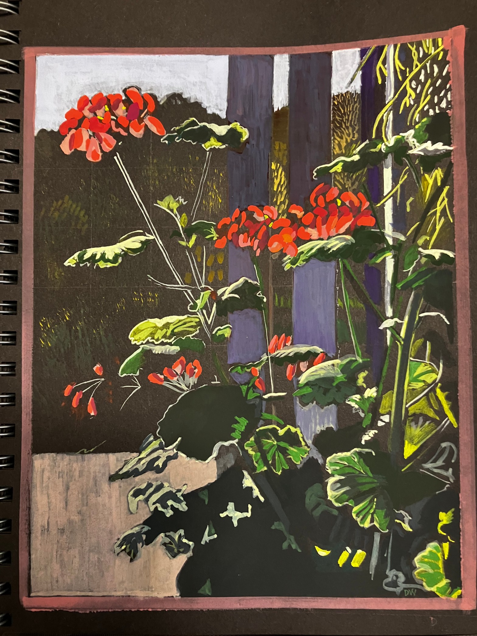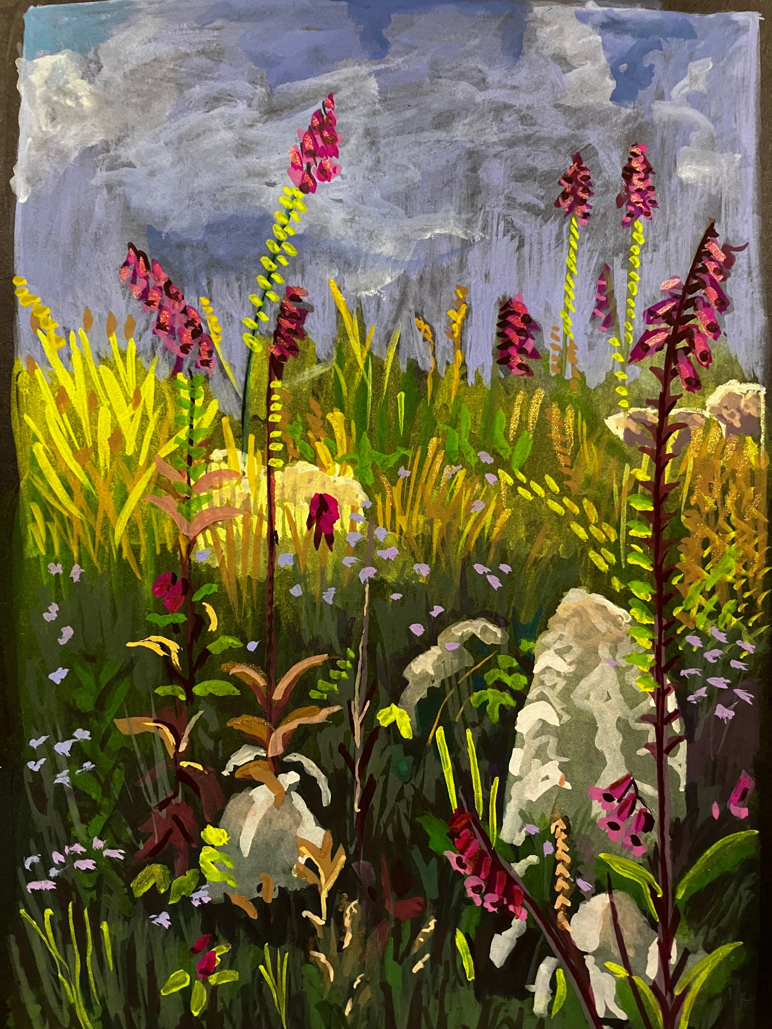 From a photograph taken in June 2023. A perfect Cornish evening, on the road to Zennor, just outside the Gurnard’s Head. The goldfinches flew away, but the golden light remained. A5 study in gouache on grey paper.
